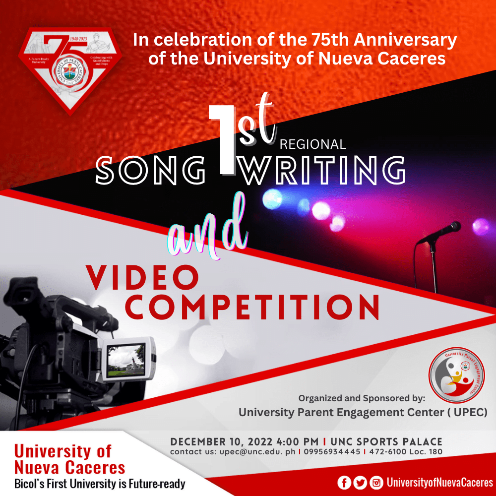 Welcoming the 75th Anniversary of the University of Nueva Caceres (UNC) in February 2023, UNC’s University Parent Engagement Center (UPEC) invites your school to join the 1st Regional Song Writing & Video Competition, a special tribute to our parents and second home.