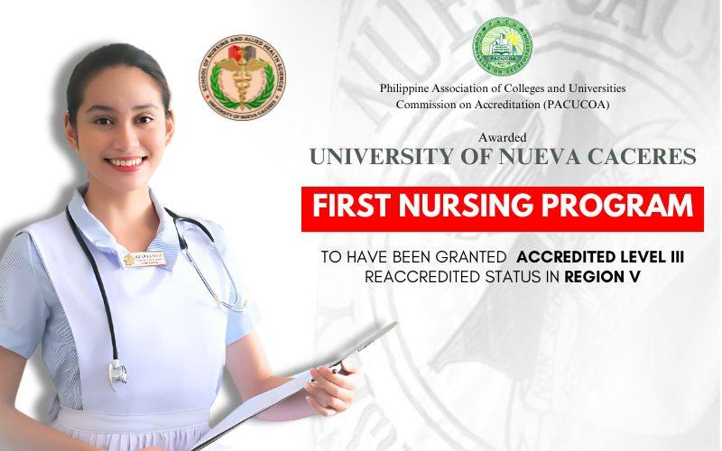 The University of Nueva Caceres (UNC) Nursing Program has set a new standard in Bicol’s educational setting by achieving the desired Level III Reaccredited Status from the Philippine Association of Colleges and Universities Commission on Accreditation (PACUCOA).