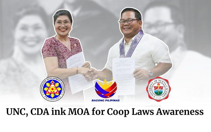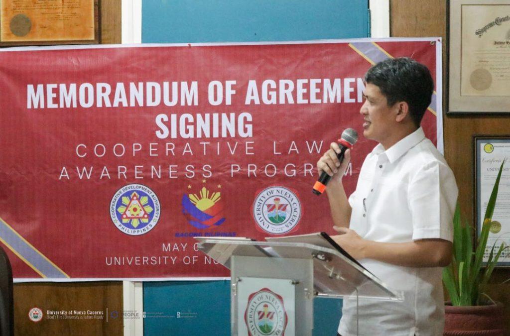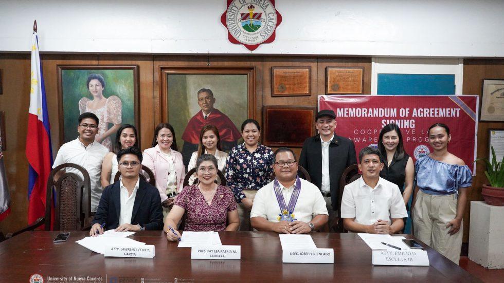 To strengthen the partnership for the implementation of the CDA Laws Awareness Program (CLAP), the University of Nueva Caceres through President Fay Lea Patria M. Lauraya and the Cooperative Development Authority (CDA) represented by Undersecretary Joseph Encabo formally signed a Memorandum of Agreement on May 3, 2024, Friday at the University of Nueva Caceres, Naga City.